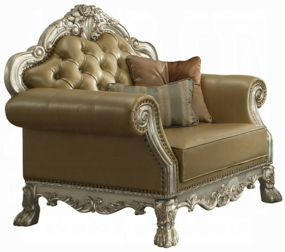 The Dresden gold patina and bone faux leather chair has a traditional feel, featuring decorative carvings, inlay veneer ball and claw feet, and hand-brushed gold accents. The seat and back have a faux leather button tufted cushion with nailhead trim.Read More