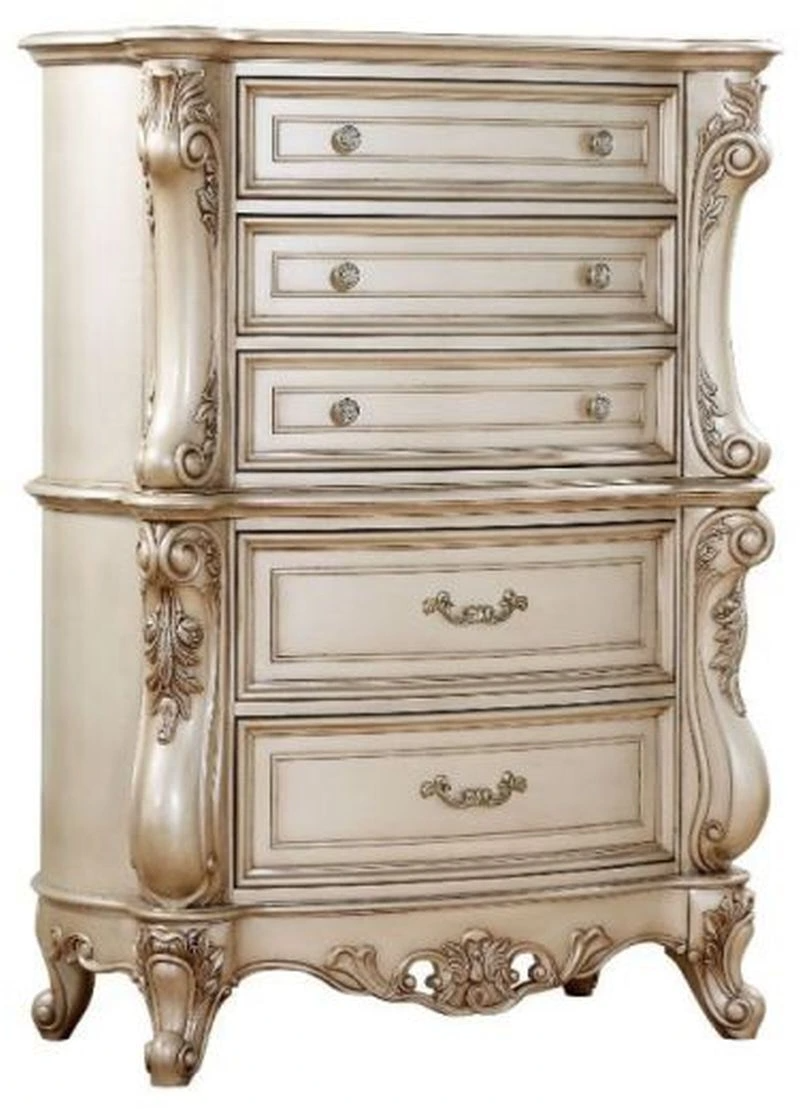 The Gorsedd bed collection is exclusively designed and filled with romantic spirit. A piece crafted and inspired by the luxurious designs of the past, this gorgeous panel bed features a stunning arched headboard and low profile footboard in an antique champagne finish. Expertly detailed, this gorgeous bed features a button tufted headboard and footboard with elaborate carvings and raised-scrolled floral molding trim on its wood frame. Add glamorous French provincial charm with this uniquely designed collection that will make a statement in any bedroom.