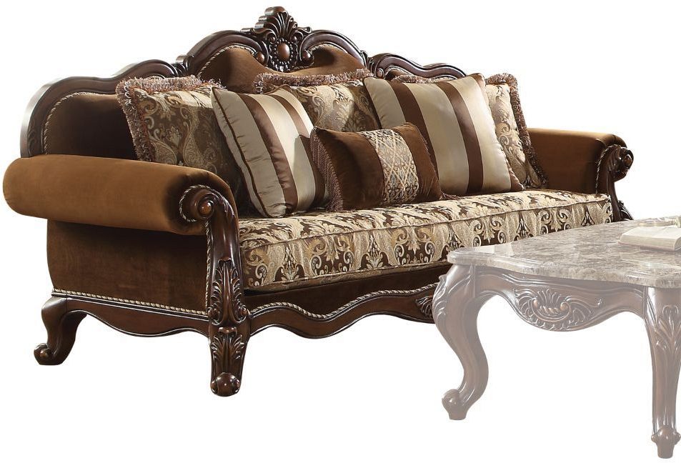 With Classic elements of rolled carved and grooved camel back leading to the center top carving, the Jardena sofa is a piece of art as well as a comfortable addition to any living room. It features an arched tight back with loose cushions, and inviting pocket coil seat cushions.Read More