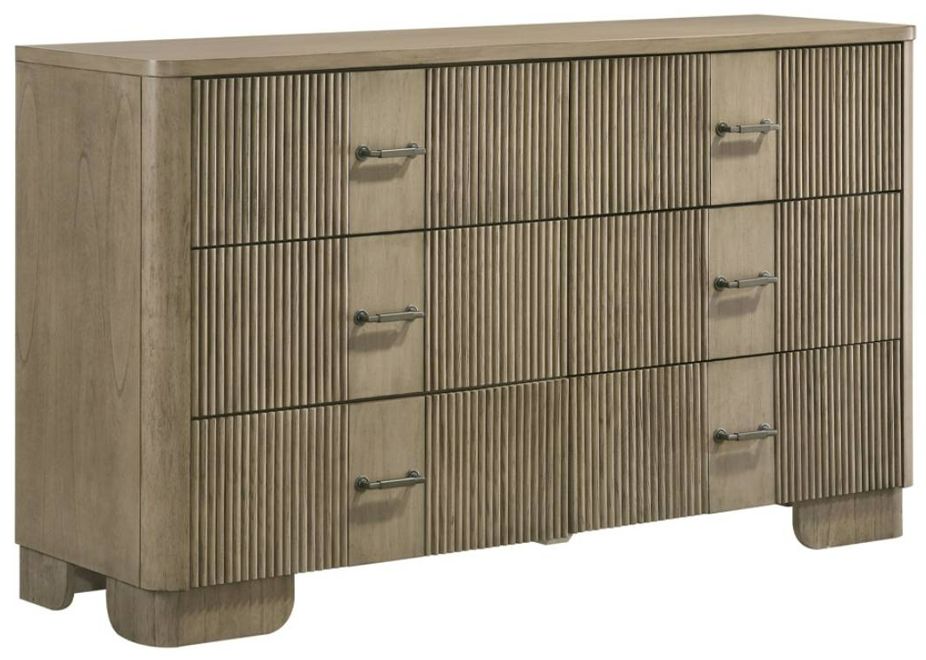 The Lakkari dresser features a rich antique oak finish with six drawers, metal knobs, and sturdy wood-composite construction. Its transitional design adds warm, functional storage and classic style to any bedroom.Read More