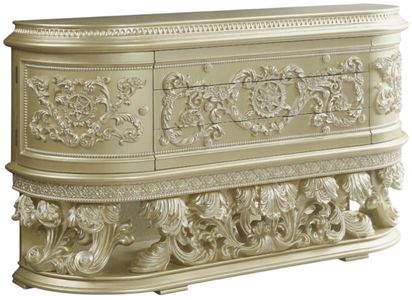 The Vatican Bedroom Collection employs a sense of timeless style in each piece, from button-tufted upholstery, and scrolled floral accents to detailed design. The Champagne gold tone lends a sleek finishing touch to matching case goods. The Vatican Collection will infuse your bedroom with glitter and endless luxury.Read More