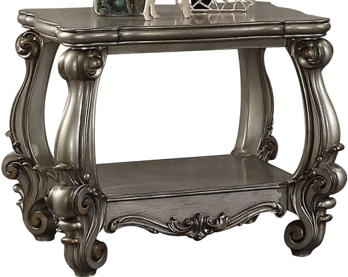 The ACME Furniture Versailles Antique Platinum End Table is an opulent addition to any luxurious living space. This square end table boasts a solid wood and veneer construction, ensuring long-lasting durability. Its antique platinum finish is richly accented with silver undertones, creating a sophisticated and regal appearance.Read More