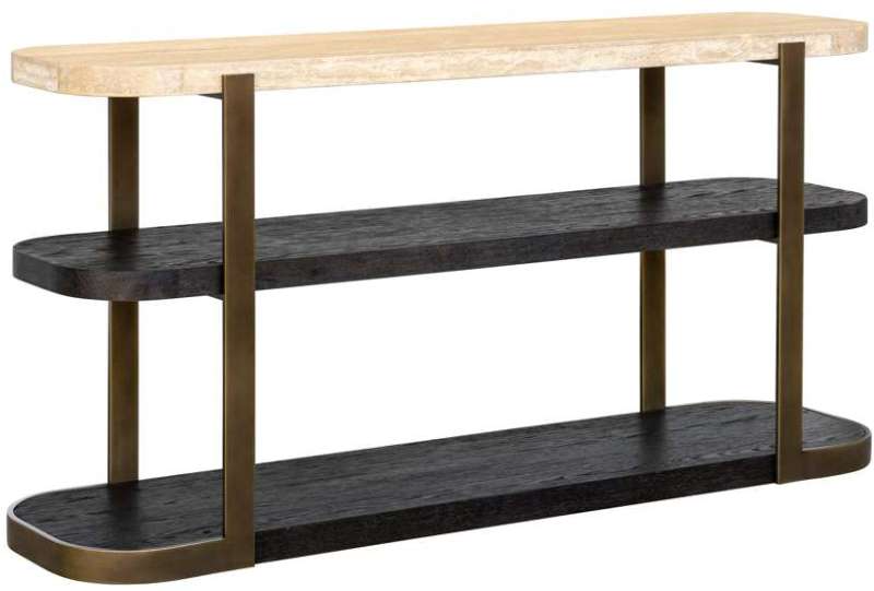 The Avalon console table seamlessly blends modern aesthetics with contemporary elegance. Its design harmoniously combines wood, stone, and metal elements, presenting a luxurious yet understated appeal. Crafted with a beige travertine stone top, a bronze-finished metal frame, and espresso oak-finished shelving, this piece exudes sophistication.Read More