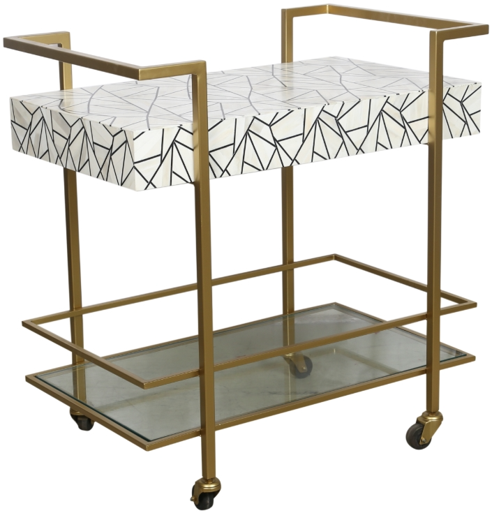 The Bottoms Up Bar Cabinet is a striking, modern-inspired statement piece. Its serving surface features a bold geometric pattern, crafted from contrasting ivory bone and black resin. The sleek iron frame is finished in a refined brushed gold, while the base incorporates a clear tempered glass shelf and casters for enhanced mobility.Read More