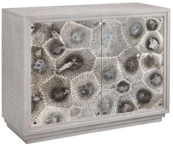 The Peninsula Ridge Bar Cabinet embodies modern design crafted from solid rubberwood and oak veneers in a soft driftwood gray finish. The two doors feature a unique Petoskey stone pattern, adding a touch of charm. Inside, discover thoughtful details like stem storage and an adjustable shelf.Read More