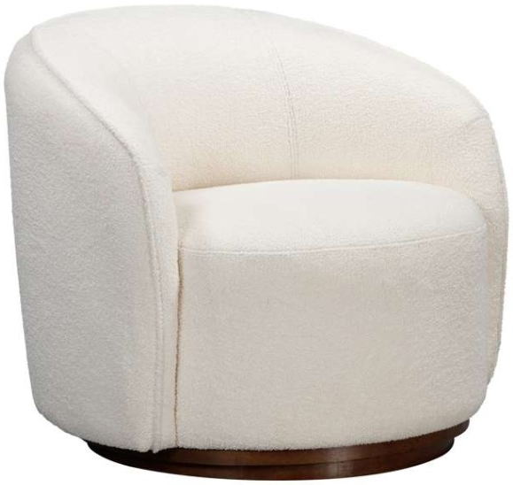 The Rory Accent Chair is a modern take on the classic barrel chair and is constructed with a solid wood frame, plush foam padding, and a 100% polyester ivory boucle fabric. Rory sits on a stepped solid wood base in a natural walnut finish and features a 360-degree swivel.Read More