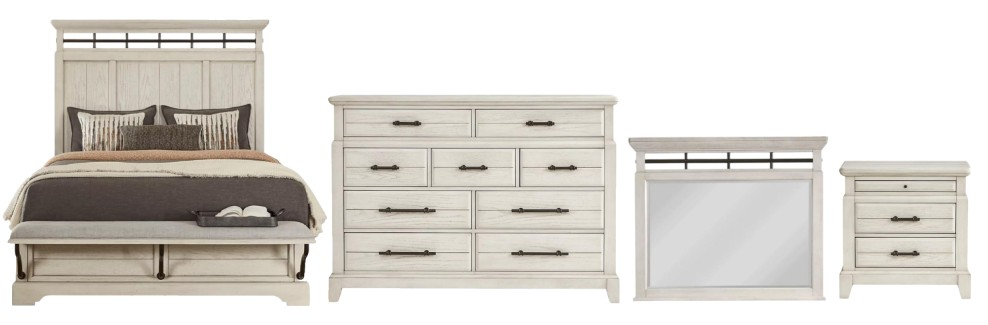 Includes a bed with bench, dresser with mirror and nightstand