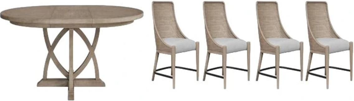 The Round Dining Table with Leaf and the four Cane Host Chairs form a cohesive ensemble that exudes sophistication and grace. Whether gathering for a formal dinner or enjoying casual meals with family and friends, the Citrus Heights Collection dining set effortlessly combines style and functionality, creating a captivating ambiance that enhances any dining experience.Read More