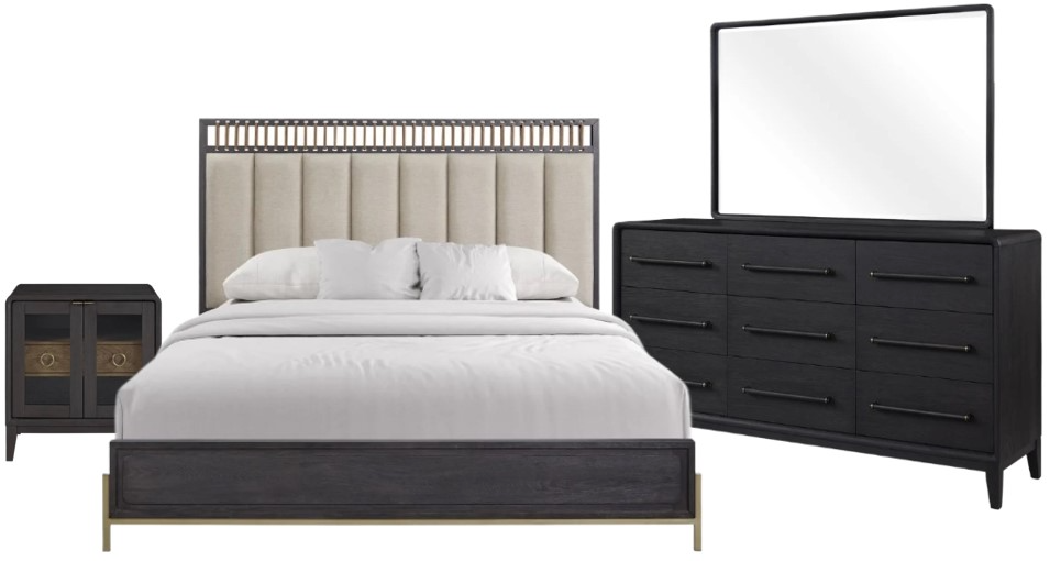 Upgrade your bedroom with the Elure 4-piece set, where modern elegance meets everyday comfort. The upholstered panel bed with chic accents pairs beautifully with a 9-drawer dresser and mirror and stylish nightstands. Finished in rich Peppercorn, this collection blends luxury, storage, and timeless design for a stunning retreat.Read More