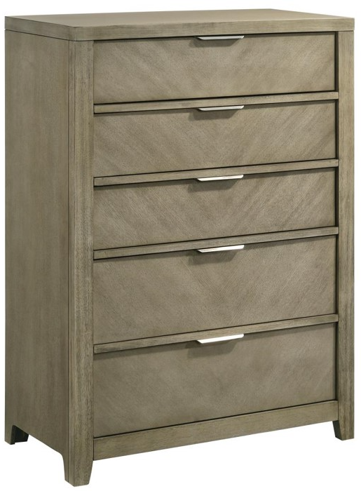 The Fresno 5-Drawer Chest perfectly blends modern style and practical storage. Its tall, streamlined design features a light wood finish and subtle geometric wood grain patterns that add texture without overwhelming the space. With five spacious drawers, it provides ample room for storing clothing, linens, or other essentials, keeping your bedroom organized.Read More