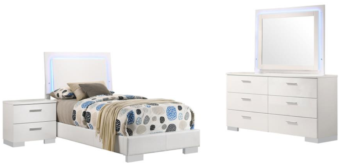 Bedroom set featuring an LED panel bed and LED dresser mirror combination