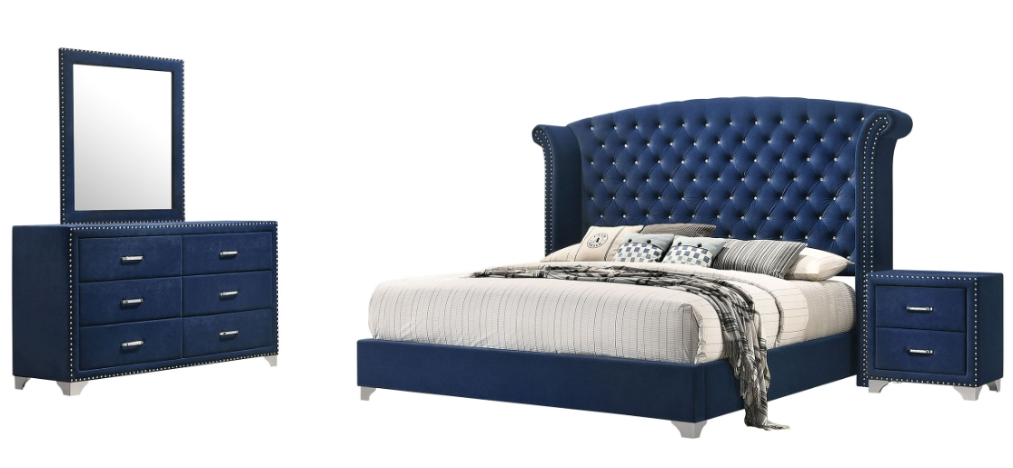Bedroom set includes tufted bed and coordinating velvet-upholstered storage