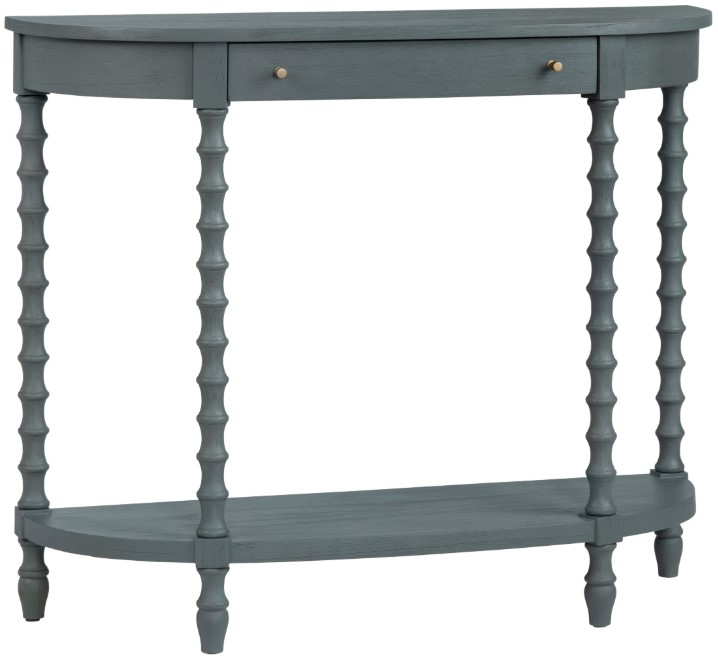 Bring a pop of character to any entry, hallway or the back of your sofa. This console pairs a graceful half-moon top with hand-turned spindle legs, all finished in a rich slate-blue wash that feels both fresh and timeless. A felt-lined drawer corrals life’s little necessities.Read More