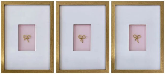 Add a touch of playful sophistication with the Crestview Collection Amelia set. Featuring three golden, dimensional rope bows against a soft pink backdrop, these elegant pieces are a delightful way to introduce charm to your nursery, bedroom, or home office. Perfectly framed and ready to bring a smile to your space.Read More