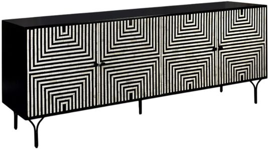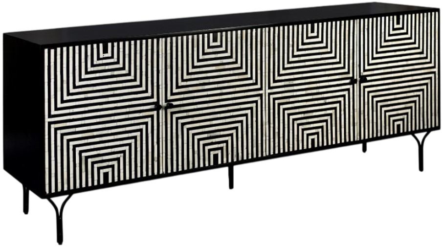 Showcasing a bold geometric pattern in black and white bone inlay, this four-door sideboard is both functional and visually striking. Built from mango wood and supported by polished iron legs, it features soft-close doors with European hinges and painted knobs for a refined finish. Two interior shelves offer generous storage.Read More