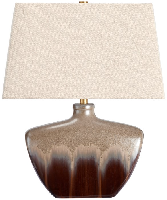 Warm and earthy, this ceramic table lamp features a flowing reactive glaze in brown and taupe tones over a wide, low-profile body. The tapered rectangular silhouette and oat linen shade bring a tailored finish to the organic texture. A clear crystal base adds a modern touch beneath a metal support ring.Read More