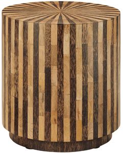 A dynamic accent piece, this round end table showcases a captivating radial sunburst pattern on top and vertical stripes along the sides. Crafted from wood in a natural and brown stain finish, it’s a statement in craftsmanship and tone. The recessed base adds a touch of lightness to the bold silhouette, while floor levelers offer added stability.Read More