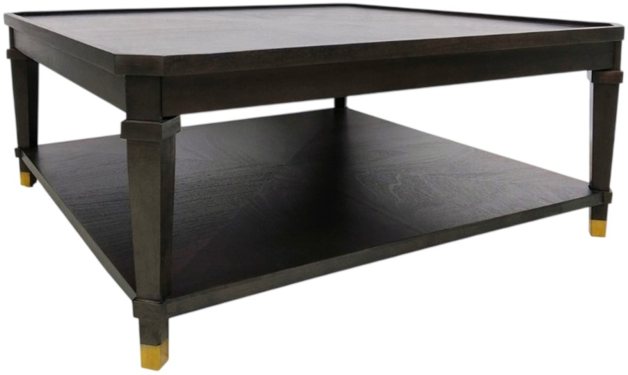 Blending style and function, this coffee table brings a refined touch to any space. A rich brown stained finish highlights the natural wood grain, while the tray-style top and open shelf offer everyday versatility. Sleek tapered legs with polished brass feet and subtle gold iron knobs complete the look.Read More