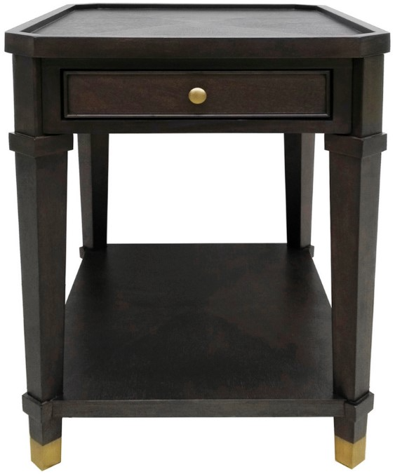 Finished in a rich brown stain and accented with polished metal, this end table brings timeless charm to any space. Crafted from hardwood and veneer, it features a tray-style top, tapered legs, and brass-capped feet for a refined silhouette.Read More