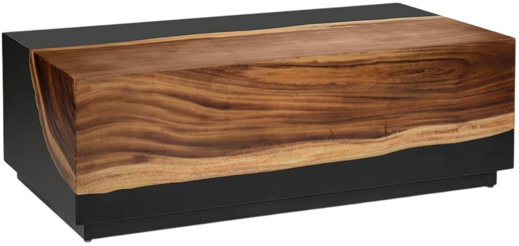 Nature meets modern minimalism. A kiln-dried acacia slab—complete with live edge and swirling caramel grain—appears to float atop a matte-black plinth, creating a 48 × 24 in. cocktail table that feels equal parts art installation and family-room workhorse. Sealant protects every surface, so you can park remotes, charcuterie or laptops without worry.Read More
