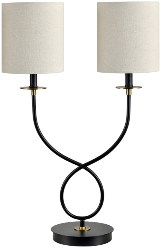 With its gracefully looping base and twin-shade design, this table lamp brings sculptural elegance to any setting. Crafted from metal with a matte black finish, it’s accented by brushed gold hardware for a touch of contrast. Two cylindrical linen shades sit atop slender curved arms, offering soft, ambient light.Read More