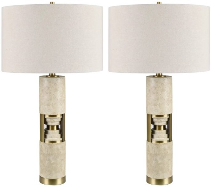 Bringing together earthy texture and elegant shine, this table lamp features a cylindrical resin body detailed with tiered center elements and brushed gold accents. The layered design is framed within an open silhouette for a dimensional, gallery-like effect.Read More
