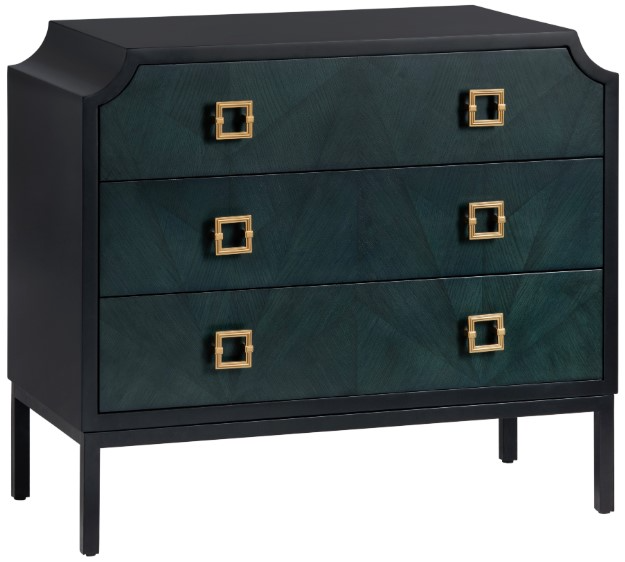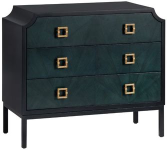 Bring bold contrast and modern function to your space with this 3-drawer accent chest. A matte black frame pairs with dry-brushed navy blue drawer fronts for a sleek, dimensional look. Brushed gold square pulls add a refined touch, while the black iron base offers sturdy support.Read More