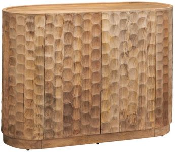 This two-door accent cabinet blends sculptural texture with organic warmth, featuring a rectangular shape with an oval top and a rich brown stain finish. Crafted from solid mango wood, it showcases hand-carved honeycomb detailing and a recessed base for grounded appeal.Read More