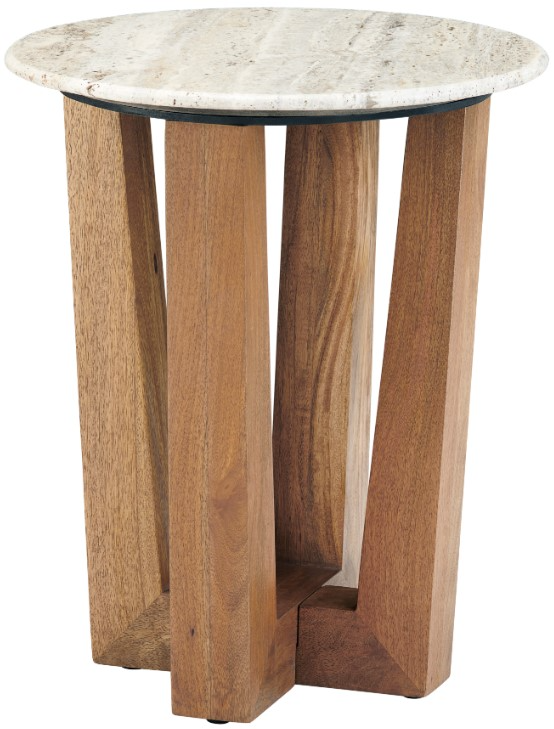 This end table offers quiet elegance through natural materials and thoughtful form. Its round travertine top showcases tonal veining in soft gray and white, resting atop a stained solid wood base. The open-frame legs angle gracefully to meet a structured base, balancing visual lightness with grounded style.Read More