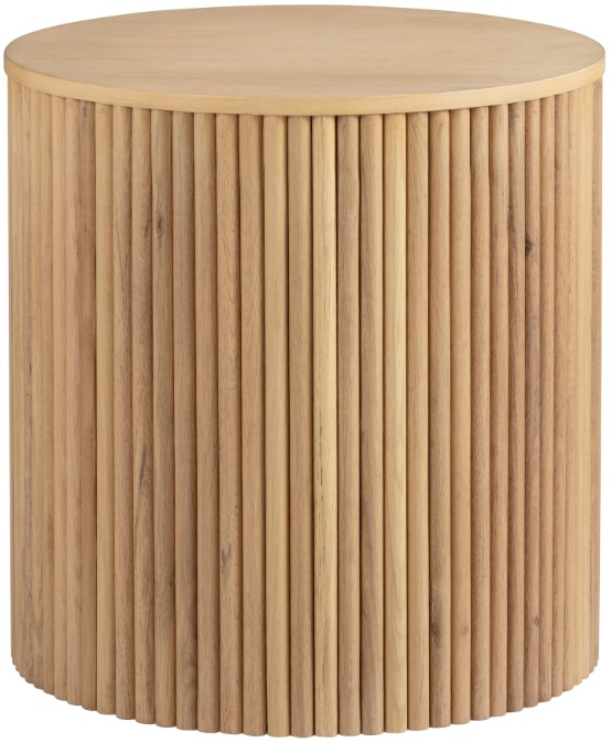 Sculptural accent, space-saving scale. Slim wood slats wrap a 22-inch drum in a warm natural finish, giving you an airy perch for lamps, plants or a morning mug while blending seamlessly with modern or coastal décor.Read More