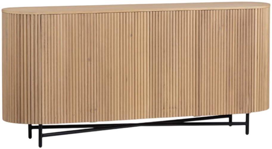 Soft curves, crisp lines. A sculpted, waterfall silhouette in wire-brushed oak veneer floats on a slim gunmetal base, giving this 72-inch credenza gallery-worthy presence. Behind four push-latch doors, adjustable shelves and cord ports tame gaming gear, barware or extra linens without cluttering your view.Read More
