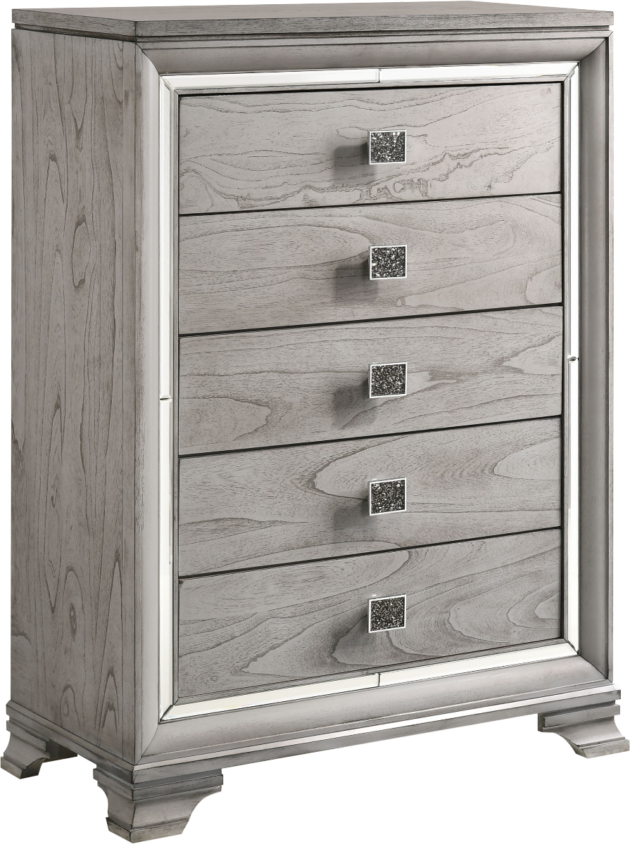 Organize your space in style with the Vail chest. The perfect combination of elegance and functionality. With its attractive gray finish and unique design, this chest adds a touch of modern flair to any room. The five spacious drawers provide ample storage for your clothes, linens, or other household items.Read More