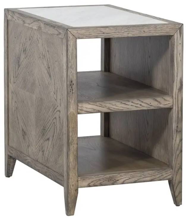 Features an inset carrara marble top with one fixed shelf.
