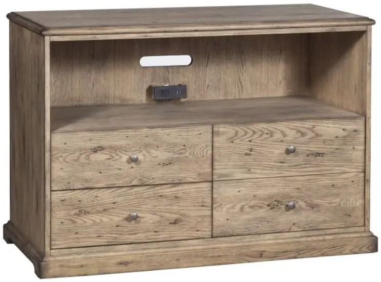 Open storage area with a USB & standard outlet.