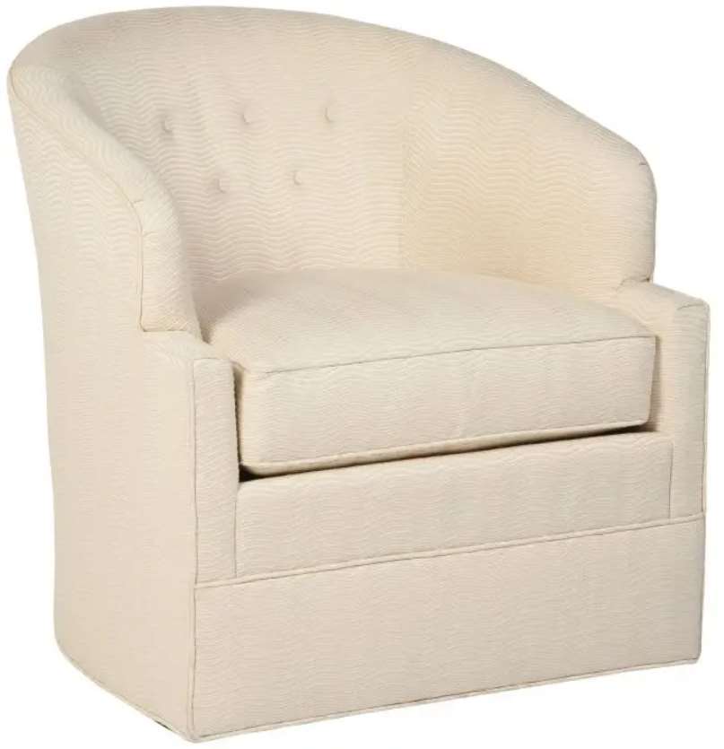 This barrel-back swivel chair has contemporary styling featuring five buttons on the inside back. The arms have a notched back shape tailored with welting. The front seat platform has a welted border. The swivel movement adds to the comfort and utility.Read More