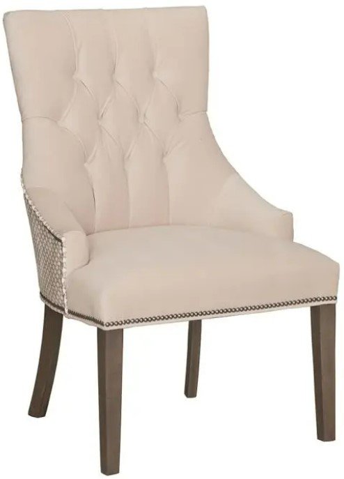 Complete your dining room setup with this elegant armchair from Fairfield. This transitional chair has low modified arms that flow from the tall rounded back. The in the back is button and tufted. The wood legs are tapered.Read More