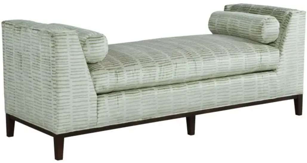 The generous scale of this chaise lounge suggests a comfortable spot to stretch out. It also serves as alternative seating in open floor plan rooms. Bolster pillows add detail and the wood legs are tapered.Read More