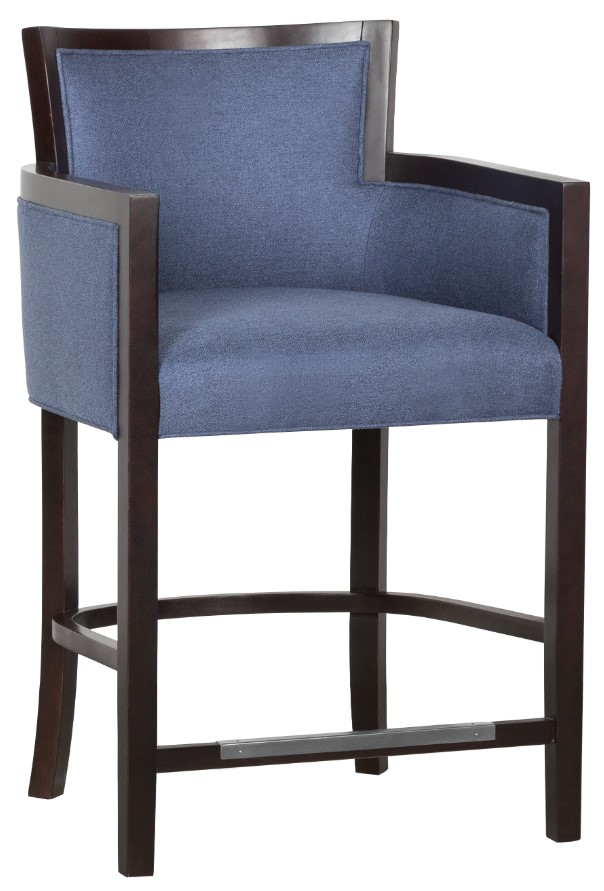 This low-back counter stool has contemporary styling. Exposed wood borders the back, and the arms and flows to the legs. The legs have stretchers. Only solid fabrics and leather should be used on the inside and back of this chair.Read More