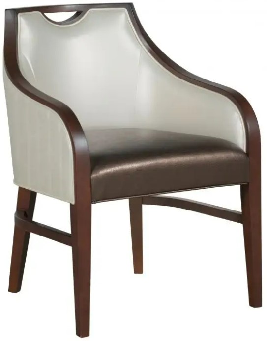 This transitional arm chair has exposed wood framing the back and flowing down the fronts of the arms. A notched opening at the top back edge provides a convenient holding spot.Read More