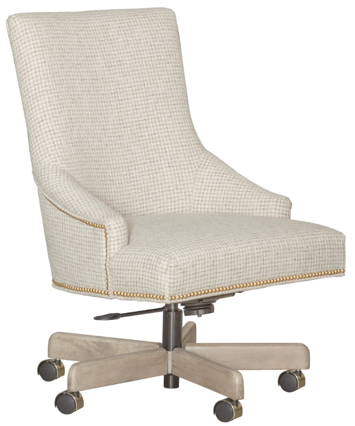 This transitional office swivel chair has low modified arms that flow from the tall rounded back. The wood swivel base has casters. Make a bold statement by incorporating this office chair into your home.Read More