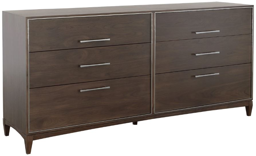 The Farley six drawer, chest maximizes storage and adds a simple elegance to this complete bedroom collection. The walnut wood is striking and available in any monogram finish with polished nickel bead highlighting the outer frame, and adds a finished element.Read More