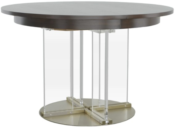 The Hotchner Dining Table blends a rich walnut top in a smoked stone finish with 3 sleek plexiglass legs and a brass metal baseplate. It's 48" in diameter and it can expand with one leaf, it's something Libby often looks for her design projects but can rarely find.Read More