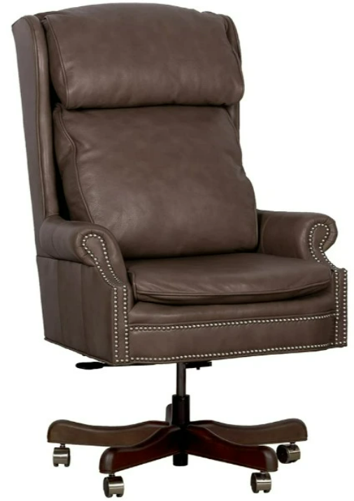 This executive swivel chair has a plush back cushion and a pillow headrest. The rolled arms are accented with panels and nail head trim. The seating comfort is enhanced with layered cushioningRead More