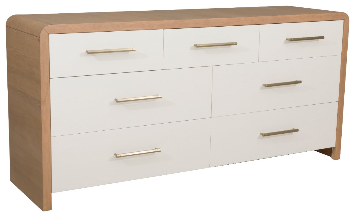 The Brentwood drawer dresser blends creamy latte drawer fronts with a natural Jute frame, accented by champagne brass hardware. It's curved lines and mixed finishes create a balanced look—both substantial and soft—making it a versatile, stylish addition to any bedroom.Read More