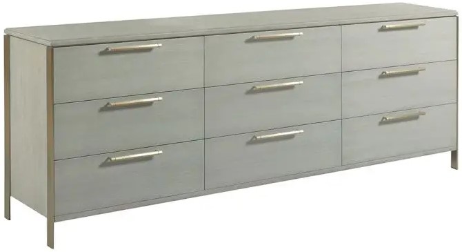 Finished in Sheer Dove with Brushed Brass metal accents and nine soft-close drawers.