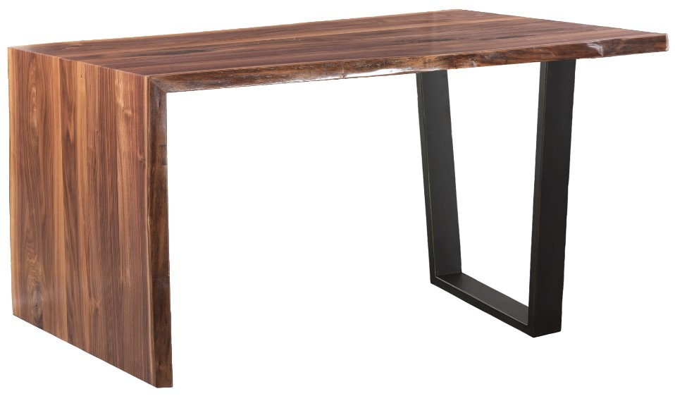 Natural American walnut with a trapezoid metal base finished in bronze