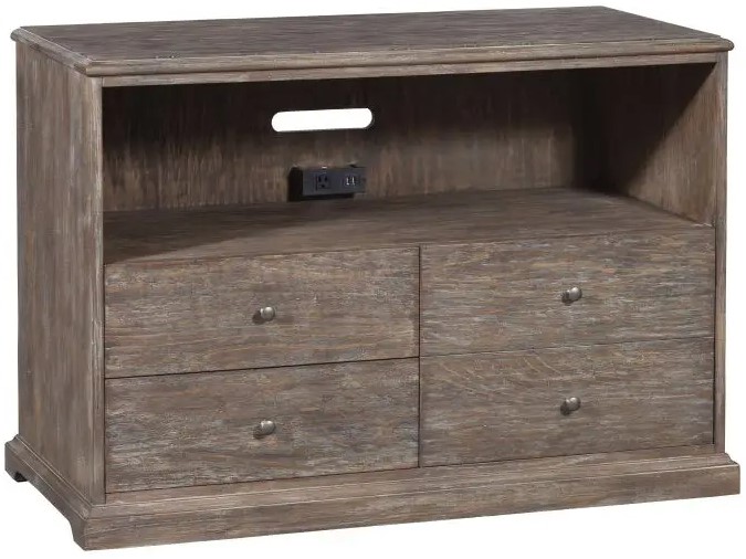 Two standard drawers and one lateral file drawer. Open storage area with a USB & Standard Outlet. Cord exit holes for equipment management.