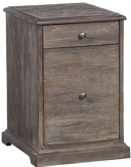 Finished in Rustique with black metal hardware and hidden casters. Includes one standard top drawer and one bottom lateral file drawer with a hidden pencil drawer.