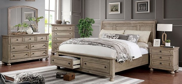 Bring tranquility home with this complete bedroom set from the Wells Collection. Mattress ready, the bed features a sleigh-back, paneled headboard and two large footboard storage drawers. Hidden night stand and dresser drawers, and a USB charger in the night stand. With classic bun feet, this look makes for one elegant set.Read More