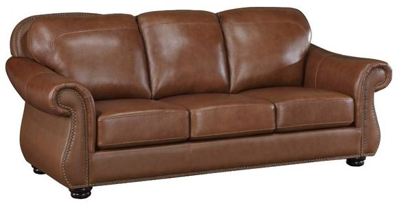 The traditional style of your home is perfectly complemented by the addition of the Attleboro Collection. Plush seating is covered with camel brown top-grain leather where the hand touches, and faux leather-match covering the remaining areas. Rolled arms elegantly curve, their fronts and the base rail of the sofa accented with nailhead trim.Read More